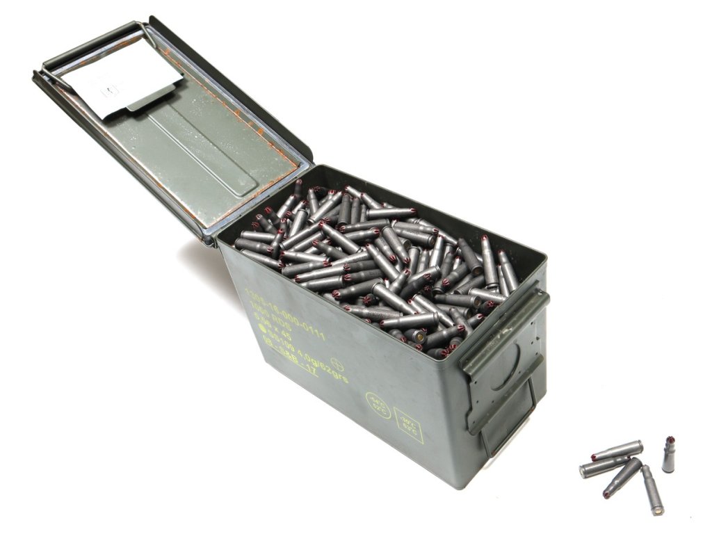 7,62x39mm Blank cvičné (,,slepé") střelivo. Schránka M2A1 obsahuje 1000 ks
