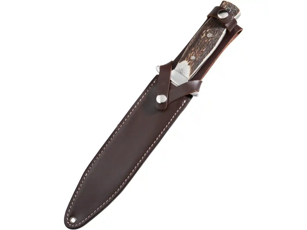 Impozantní lovecký nůž s 4 mm silnou dvousečnou čepelí z nerezové oceli 440 je vhodný pro nejnáročnější venkovní použití i pro zachycení silné zvěře. Makety rukojetí jsou vyrobeny z pravého jeleního parohu a zakončeny jemnými mozaikovými špendlíky. Velká záštita umožňuje bezpečnou práci. Nůž je dodáván s vysoce kvalitním koženým pouzdrem. Opasek je vyroben ze zrnité hnědé kůže a je dlouhý 112 cm (bez spony 109 cm). Nápadná kovová přezka opasku s filigránským, vystouplým kančím motivem dělá z opasku absolutní poutač. Šířka pásu 3,8 cm. TECHNICKÉ PARAMETRY: Délka čepele: 23 cm Ocel čepele: nerezová ocel 440 Tloušťka čepele: 3,85 mm Materiál rukojeti: jelení paroh Celková délka: 38 cm Hmotnost: 446 g