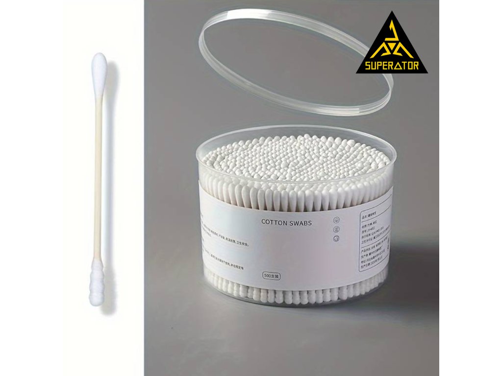 Box vatových tyčinek na čištění 500 ks. Na jednom konci oválné na druhém spirála.